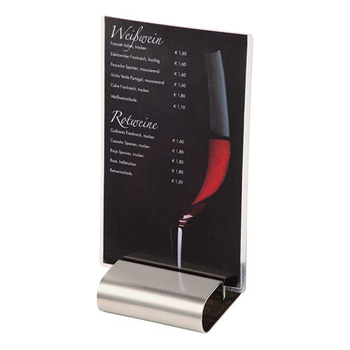 Het programma omvat verschillende menukaarthouders en menustandaards. Deze zijn uitgevoerd in roestvrijstaal, plexiglas en of hout.
