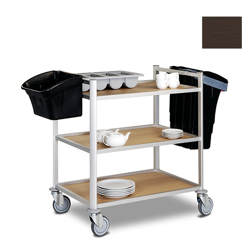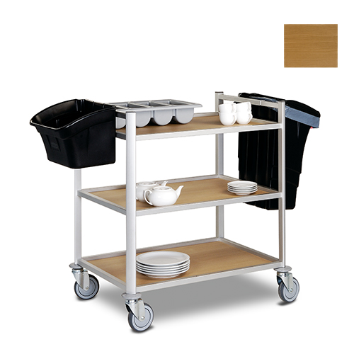 Serveerwagens uit kunststof en aluminium, voorzien van volkern of houten afzetbladen in diverse afmetingen.