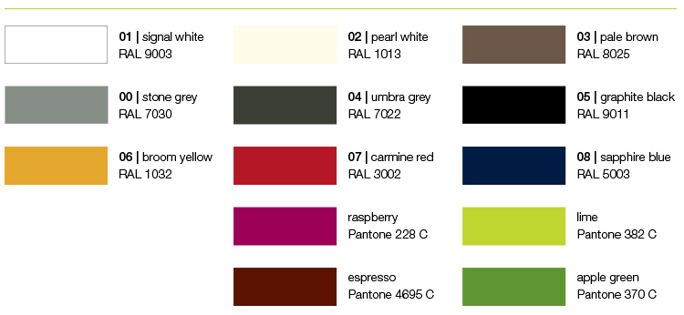 01 blanc de sécurité (RAL 9003), 02 blanc perlé (RAL 1013), 03 brun pâle (RAL 8025), 00 gris pierre (RAL 7030), 04 gris ombré (RAL 7022) 05 noir graphite (RAL 9011), 06 jaune genêt (RAL 1032), 07 rouge carmin (RAL 3002), 08 bleu saphir (RAL 5003), mûre Pantone 228 C, citron Pantone 382 C, expresso Pantone 4695 C, vert pomme Pantone 370 C